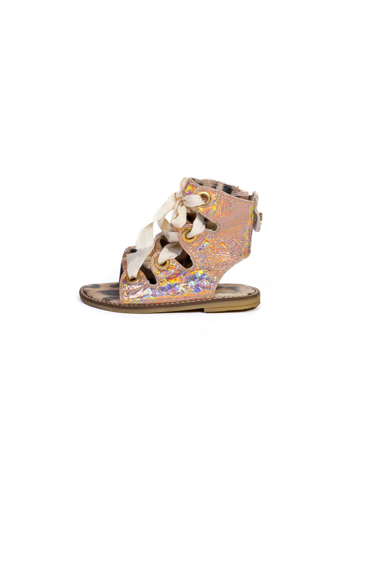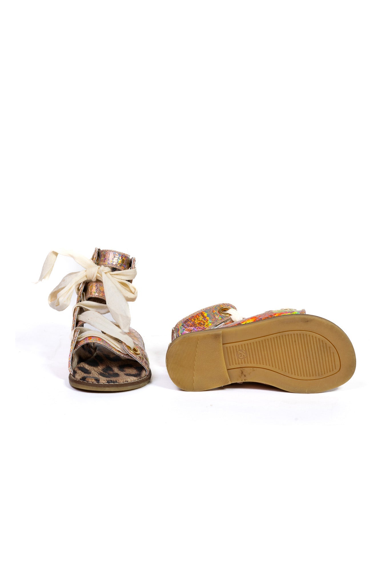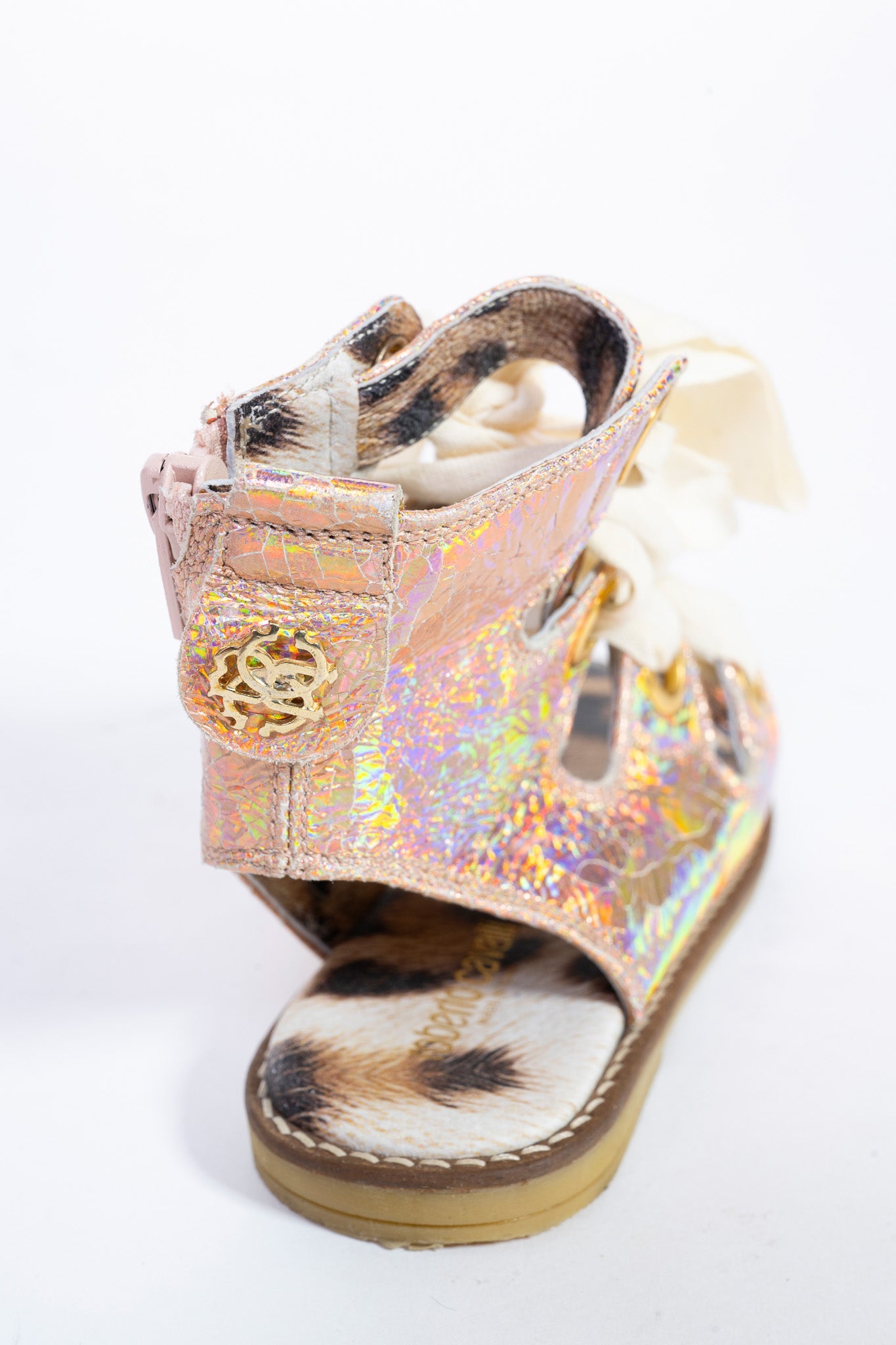 Sandali bassi alla caviglia laminato. Apertura in punta e al tallone e chiusura con lacci regolabili e zip laterale. Suola piatta con stampa animalier.