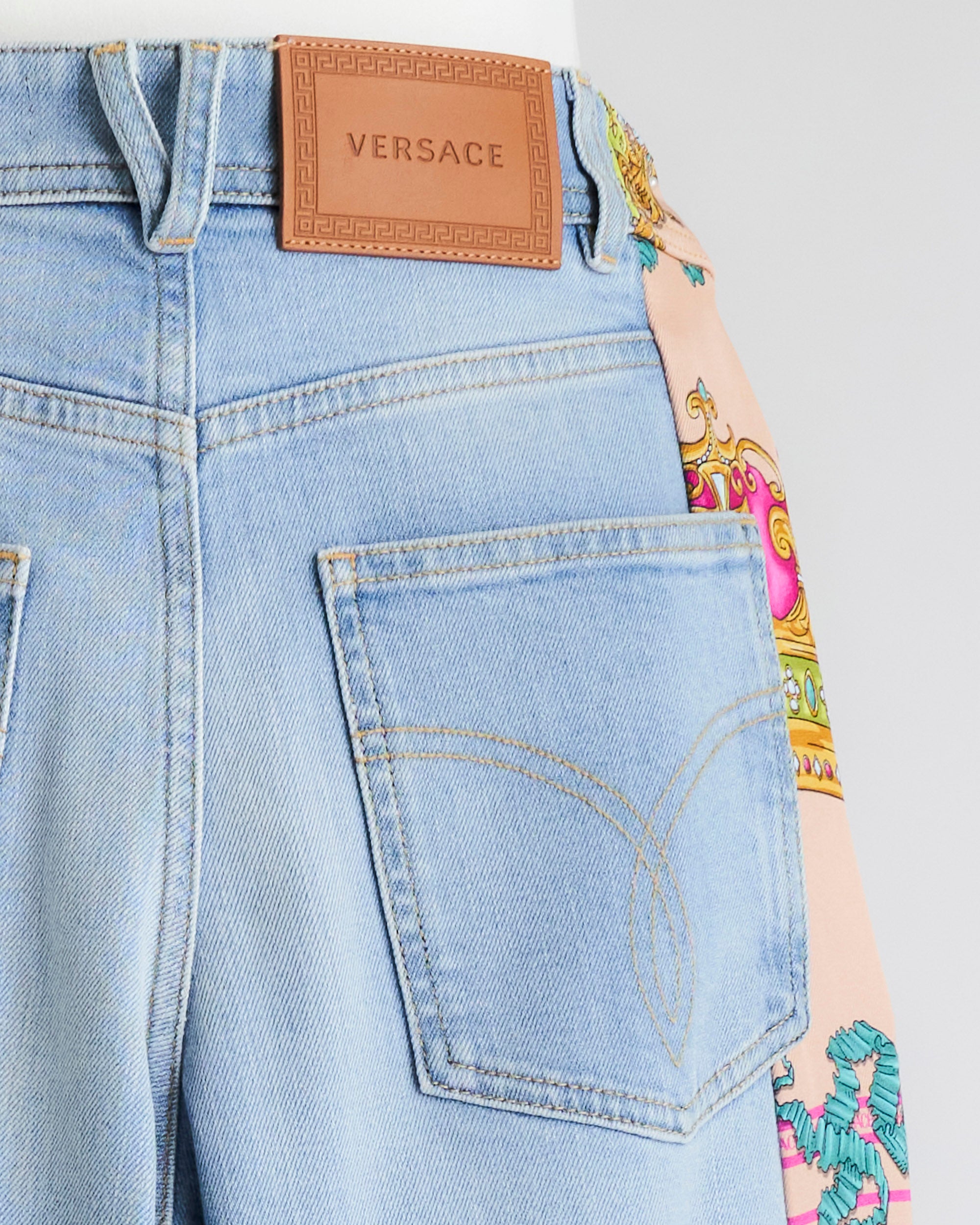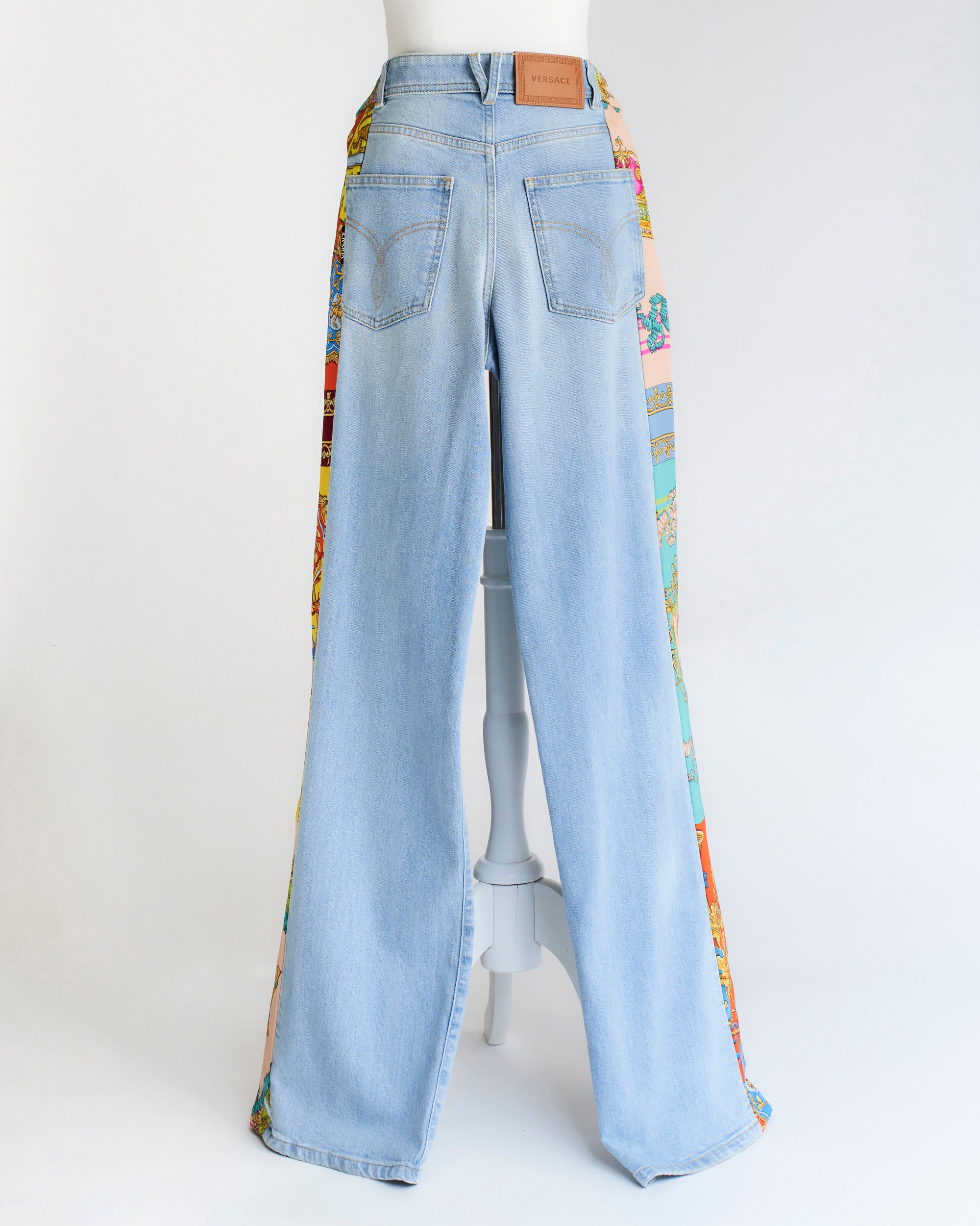 Jeans a gamba larga, inserto in tessuto con stampa sul lato.